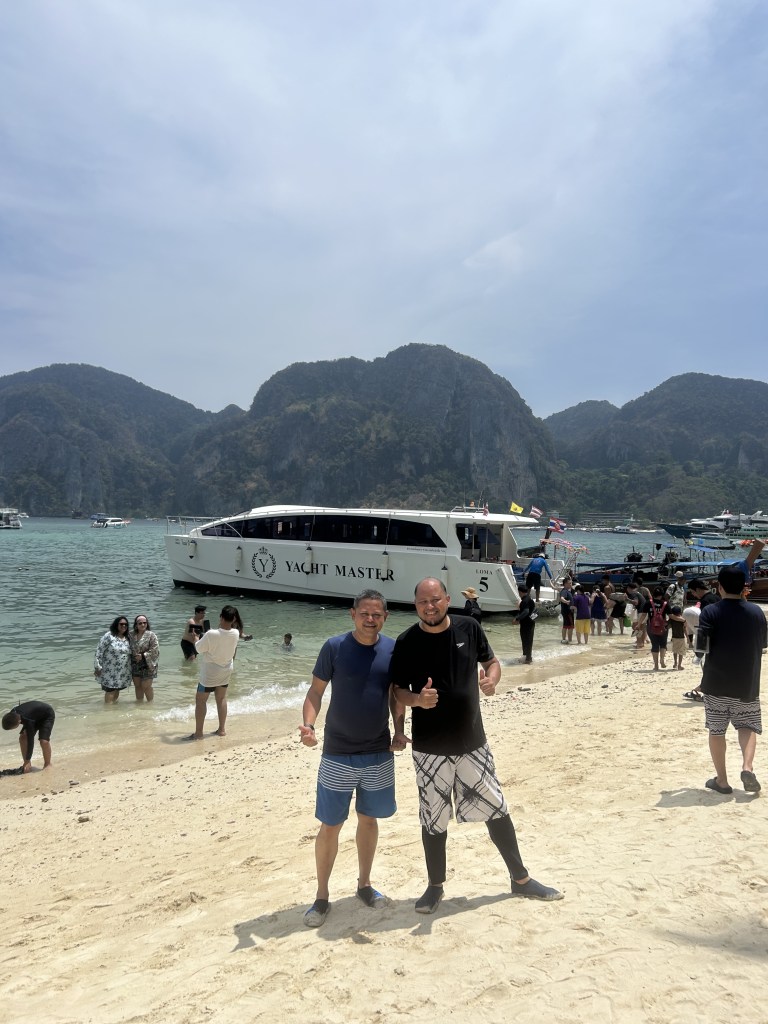 The catamaran grounded from the stern on one of the beach in Phi Phi Island. All about thirty of us offboarding Yacht 5 on the beach and in line headed to a hut where we had our lunch; a buffet lunch. An hour for lunch and all we can firstly do was to grab three seat for ourselves especially when the tables are about 90% occupied. We managed to get seats after 15 minutes and made way to the queue for the buffet ‘leftovers’, taking turn. After swift filling up of our tanks, we managed to explore the island, and grabbed a vanilla ice cream each to cool off our throat under this terrible heat. Yes there is nothing we can do but endure this 40 plus degree Celsius of discomfort right from the beginning of the trip. Well, it is all for the swim. One thing for sure, it is dry and do not make us drenched with sweat like in Singapore. Other than that, there are really nothing much on this island except we grabbed a few souvenir and shirts and headed back to our ship. That one hour is well spent although we thought we did not have enough time atop of the crowded dining table and the given lunch time